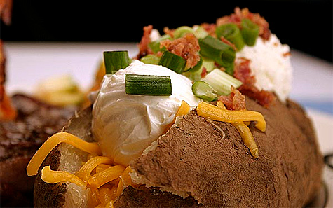 Разогреть духовку до 200 гр. С. Картофель вымыть и обсушить салфеткой. Натереть каждую картофелину оливковым маслом и посыпать солью - это сделает кожуру хрустящей. Поместить картофель на противень и запекать до полной готовности. Чтобы проверить готова ли она, слегка сожмите картофелину - она должна быть мягкой. Запекать лучше в фольге, обернув каждую картофелину. Вынуть из духовки и сделать в каждой картофелине глубокий крестообразный глубокий разрез. Подавать картофель с наполнителями в небольших пиалах.